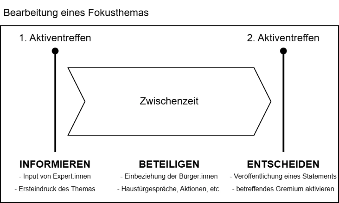 - Zum Abschluss des Fokusthemas diskutieren wir beim zweiten Aktiventreffen einen Monat später miteinander Lösungsansätze, um daraus ein Statement der Stadtteilgruppe zu formulieren und zu veröffentlichen. Diese dienen als Grundlage für die Arbeit der Bezirksverordnetenversammlung und unserer Abgeordneten, die selbst Teil unserer Stadtteilgruppe sind und unsere Anliegen in die betreffenden Gremien tragen können