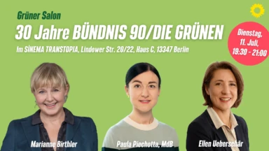 Veranstaltung: Grüner Salon 30 Jahre BÜNDNIS 90/DIE GRÜNEN - Ein Abend mit Marianne Birthler, Ellen Ueberschär & Paula Piechotta MdB Luise Pann Wann? Dienstag, 11. Juli 2023, 19:30 – 21:00 Wo? SİNEMA TRANSTOPIA Lindower Str. 20/22, Haus C 13347 Berlin (S+U Wedding) Kontakt Lara und Timur Meinem Kalender hinzufügen